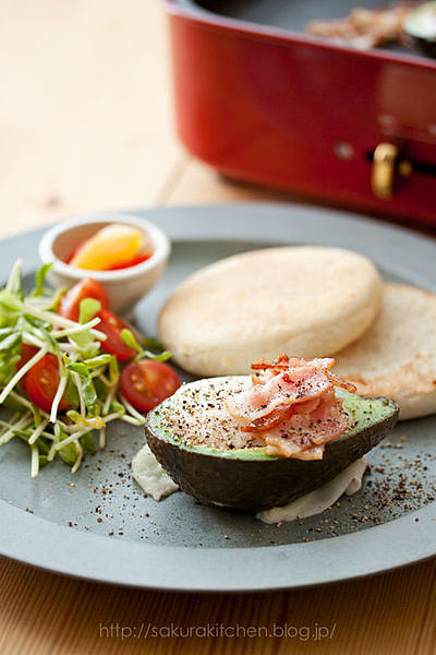 2. アボカドを中央にのせ、卵を割り入れます。水大さじ3を周りにかけて、蓋をして5分程加熱し、様子を見て卵が好みの状態になったら、蓋を取って水分をとばします。