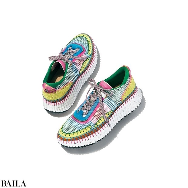 クリエイティブ・ディレクター、ガブリエラ・ハーストが手がける最新コレクションから、遊び心たっぷりのスニーカーをピックアップ。「コーデを活性化する高感度デザインはもとより、重量の40%はリサイクルマテリアルという環境に優しい作りにも共感。想像以上に軽いのも優秀です」。靴「NAMA」¥99000/クロエ カスタマーリレーションズ(クロエ)