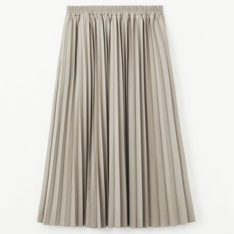 合皮素材を使用した、抜群に高見えするプリーツスカート。プリーツが細かく動くたびに揺れるシルエットが上品で、甘くなりすぎず女性らしい雰囲気を演出します。