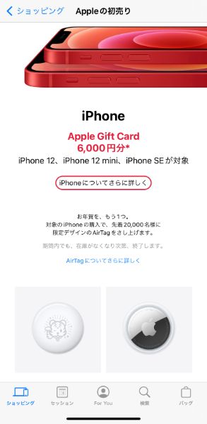 「iPhone 12(税込8万6800円〜 )」、「iPhone 12 mini(税込6万9800円〜)」、「iPhone SE(税込4万9800円〜)」のいずれかを購入すると、それぞれ6000円分のApple Gift Cardがもらえますよ。