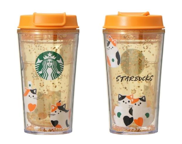 マグを持ったり、カップに見え隠れしたりといった、様々なポーズの三毛猫をデザインしたタンブラーです。キラキラ光るコンフェッティも華やか。