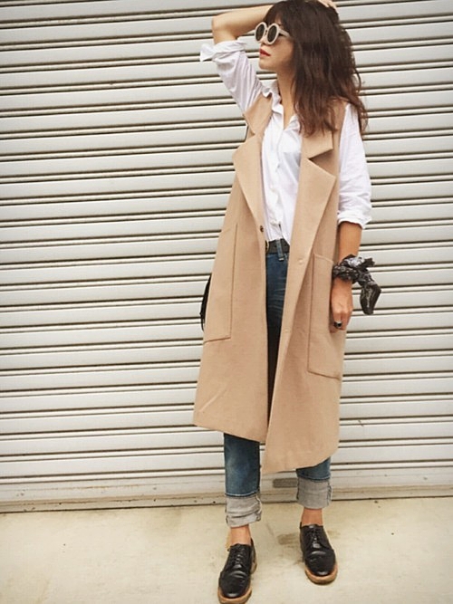 ラフなスタイルもロングジレをプラスするだけでカッチリ見えるので不思議。