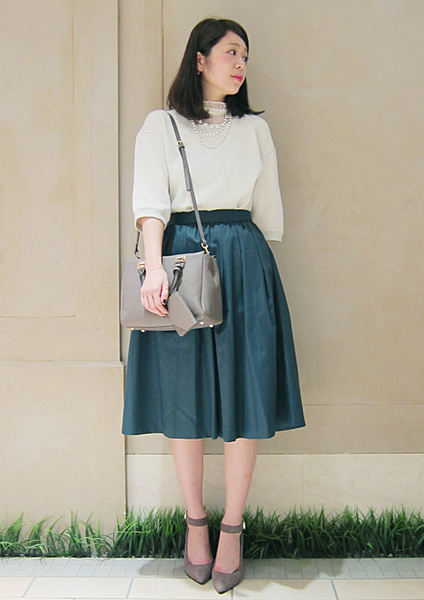 足の甲が隠れたデザインのパンプスは、スカートのように足の露出が多いコーディネートにオススメ♪足先を露出しすぎないことで、スッキリとした印象になります。