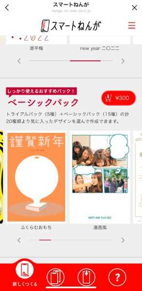 作成画面では、複数のテンプレートがセットになった、年賀状セットの選択からおこないます。