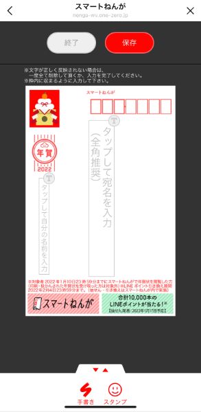 宛名書きは、テキスト機能で手軽に打ち込めたり、手書きで丁寧に書き入れたりすることも可能。