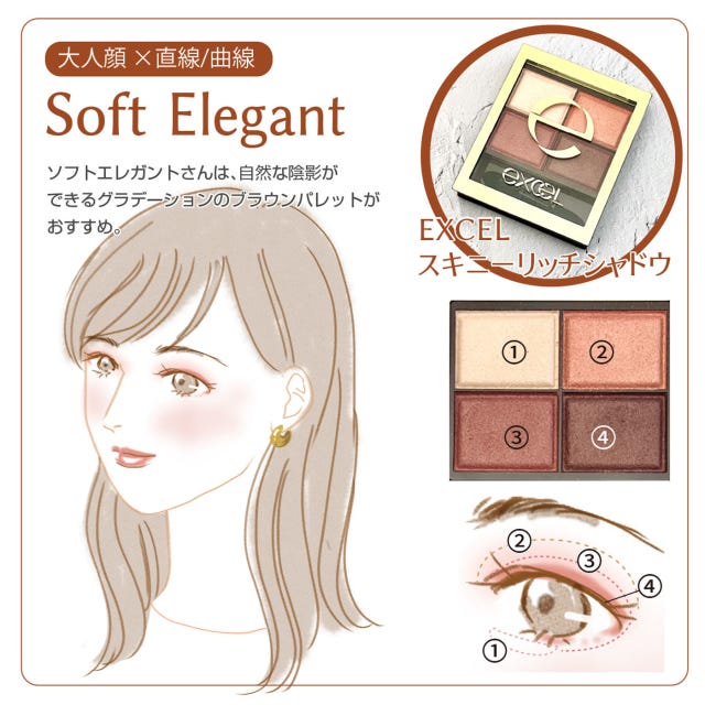 ソフトエレガントさんは全体のメイクのトーンが揃うと上品で美人度が上がるので、アイメイクも温かみのあるブラウンがおすすめ。