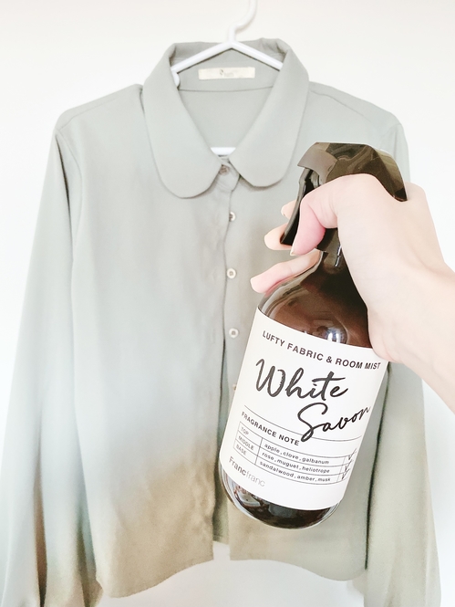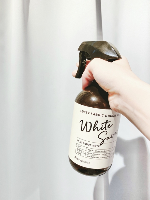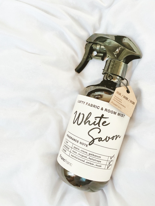 こちら、フランフランの「ルフティー ファブリック&ルームミスト ホワイト」です。ホワイトサボンの香り。