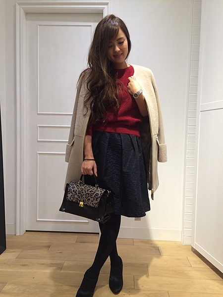 深みのあるレッドをパンプスで使って、大人っぽいクリスマスコーデもGood!黒のパイピングがコーデを引き締めてくれます。