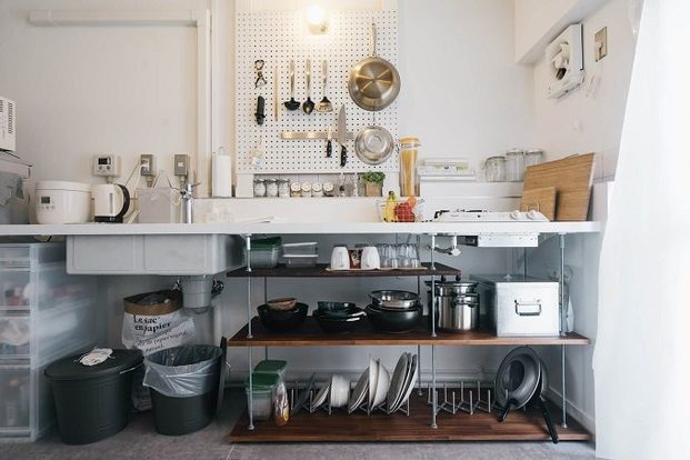 壁にかけたり、扉をとりはずしたりして収納をオープンにしてみるのも、物を減らすにはうってつけ。