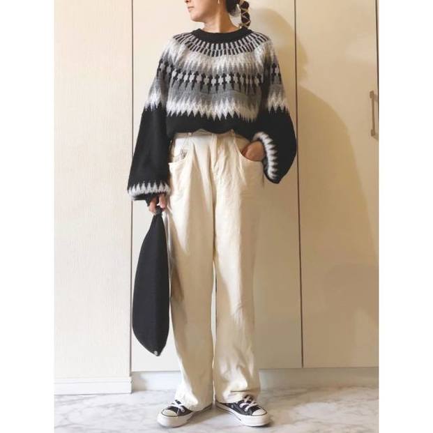 ノルディック柄ニット×白パンツのコーデと相性抜群!