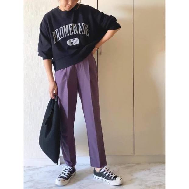 ロゴスウェットにパープルのスラックスを合わせたコーディネート。足元もカジュアルなアイテムを合わせることで、今年らしい雰囲気に仕上がります。