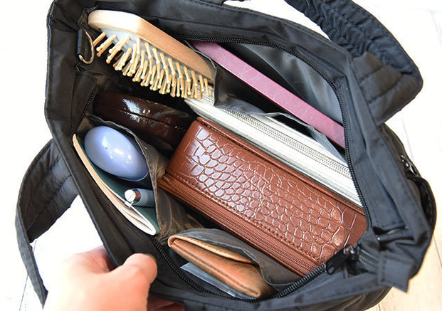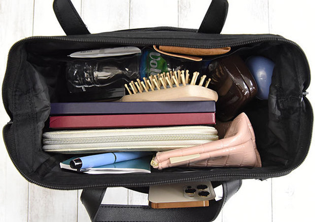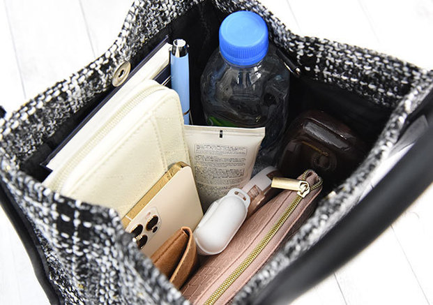コンパクトな見た目に反して、長財布や500mLのペットボトルがすっきり収納可能。開口部には荷物の目隠しや飛び出し防止にうれしいマグネットボタン付き!