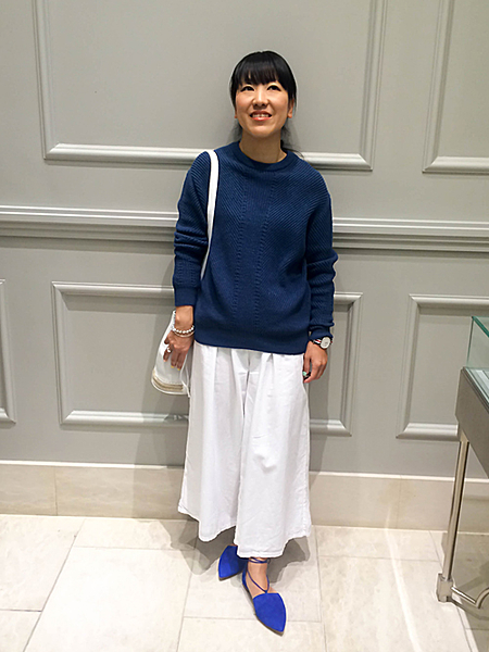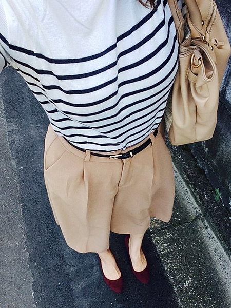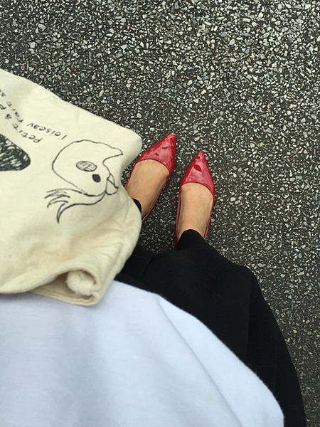 エナメルとスエードの異素材コンビ。細いヒールとポインテッドトゥが女らしく仕上げてくれます。スカートとクルーソックスに合わせてより女らしく♪