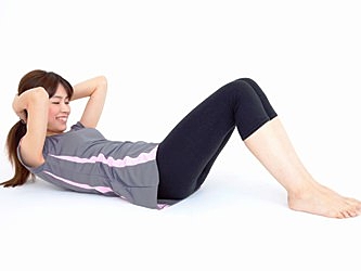 (2)両手を頭の後ろで組んで、ゆっくりと上半身を起こしましょう。