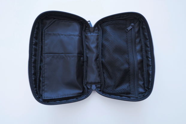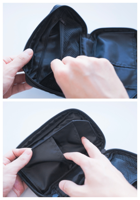 ポーチを開くと、左右両方に仕切り付きの収納スペースがあるんです。