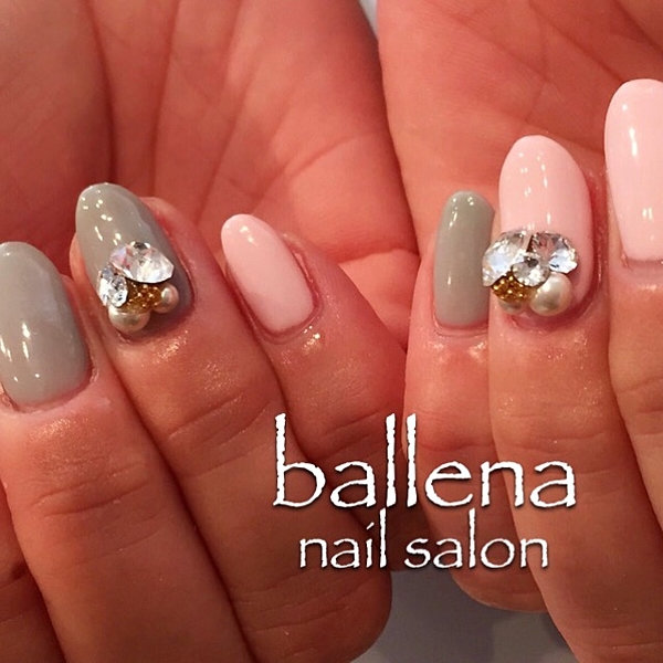 グレー×ピンクにはスタッズなどでバランスよく◎