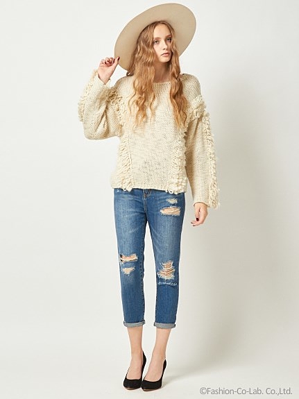 袖とフロントに施された、ボリューム感のあるループフリンジが魅力の1着です。凹凸感のある太番手のスラブ糸を使用しており、表情豊かな生地感が特徴。