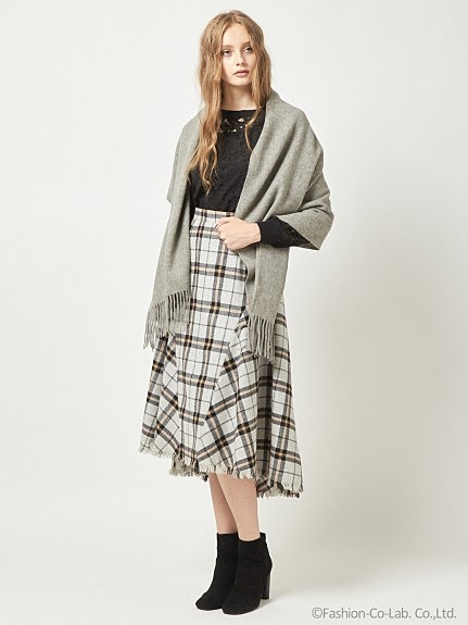 ざっくりとしたウォーム感のあるツイードチェックのミディ丈スカート。ヒップラインから前の裾にかけて切り替えたラインは腰の位置を高く見せて脚長効果のある1枚。