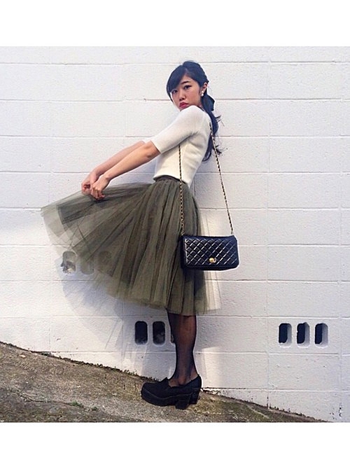 FRAY I.D (フレイアイディー)のチュールスカートは今年の流行のカーキ。