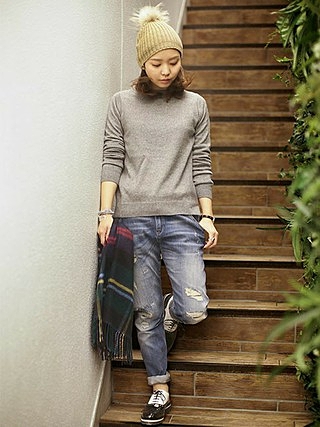 ストールとの相性も良いクルーネック。今年は開きの少ないデザインが狙い目です。付け襟やシャツインするのもお勧め!