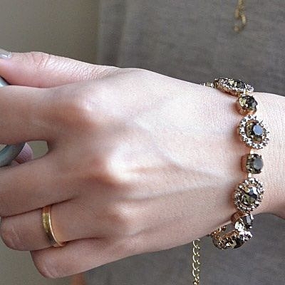 レザーでカッコいいブレスレットですが、大ぶりのビジューが付いているので女性らしさも忘れさせません。