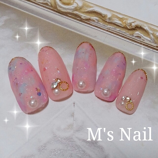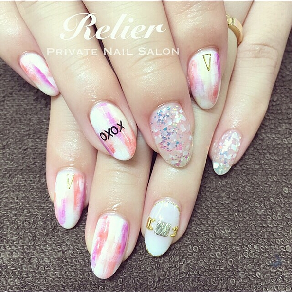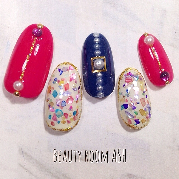 カラフルだけど、パールのビジューでしっかりまとまったネイル!