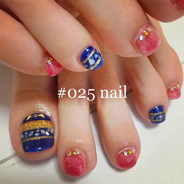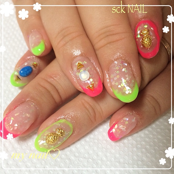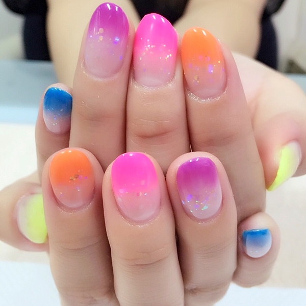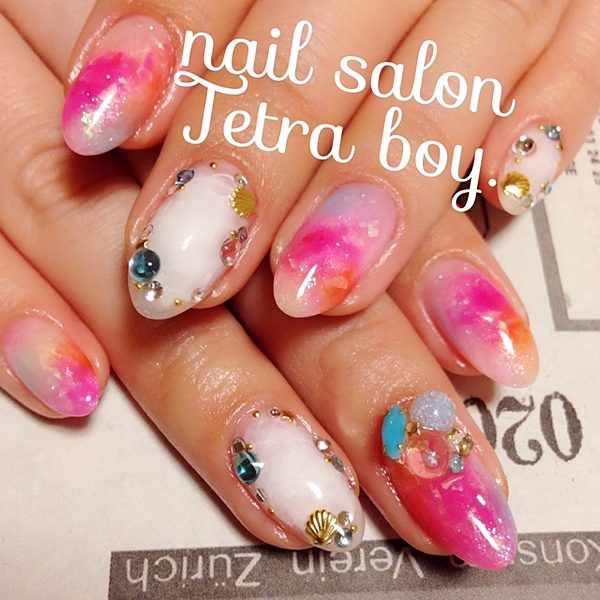 発色のいいカラーと、カラフルなシェルを使ったネイル♡