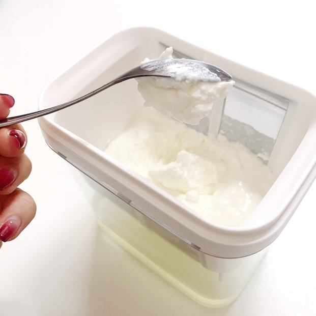 Amazon(アマゾン)で見つけた「パール金属 濃厚水切りヨーグルト」。市販のヨーグルトを容器に入れて、24時間置いておくだけでクリームチーズのような濃厚な水切りヨーグルトが作れちゃう!色々な料理に使えるから、我が家でも大活躍中です。