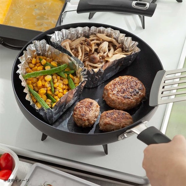 取っ手が取り外せるためコンパクトに収納できる、ストーンマーブルのフライパン。汚れがこびりつきにくく食器洗いがラクに片付きます。