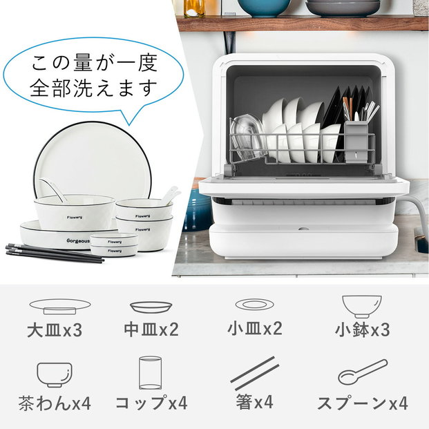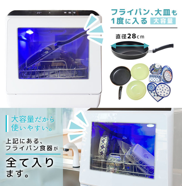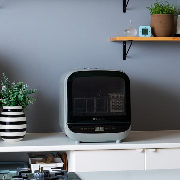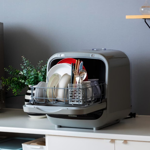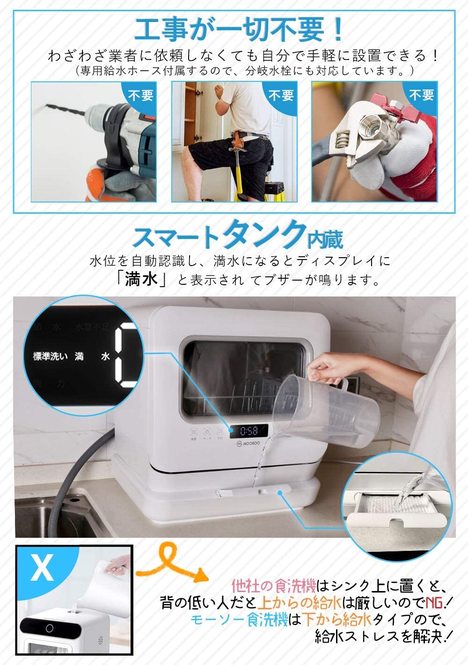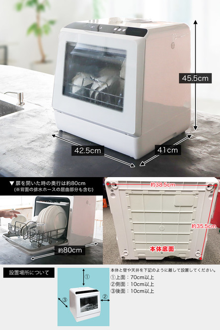 食洗機といえばキッチンの場所をとるイメージがありますが、食器の水切りカゴを置いているスペースがあればOK!背面のタンクは着脱可能で水道から直接水を注ぐことができます。