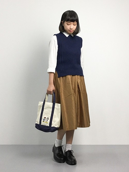 ネイビーのノースリニットに白シャツを