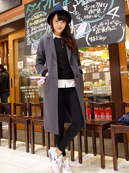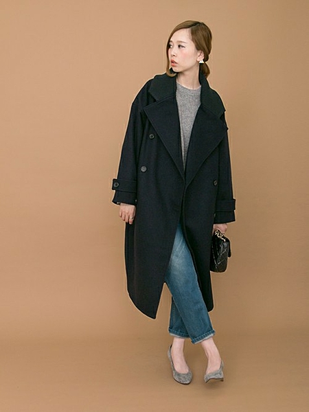 コートより色の濃いグレーのボタンがパッと目を引き、クールな印象に。