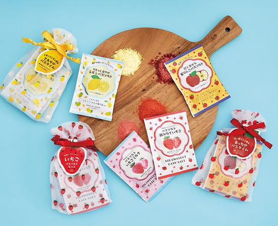 画像左から、フルーツの森 バスソルトセット(さわやかレモン、いちご、蜜りんご)/各605円(税込)