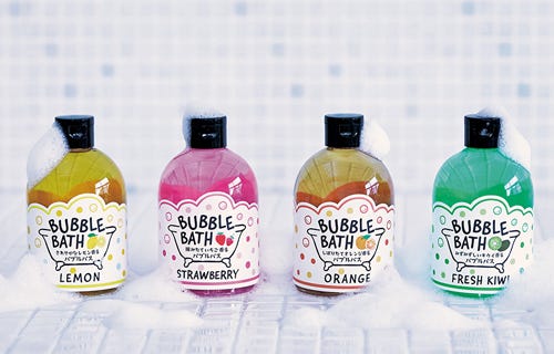 毎日のお風呂がちょっとリッチになるバブルバスが楽しめる、ふわモコ泡の液体入浴料。香りごとにそれぞれのフルーツエキス配合で、肌がしっとりうるおうのを実感できる。泡でお湯が空気に直接触れないので、湯温が冷めにくいというメリットも。