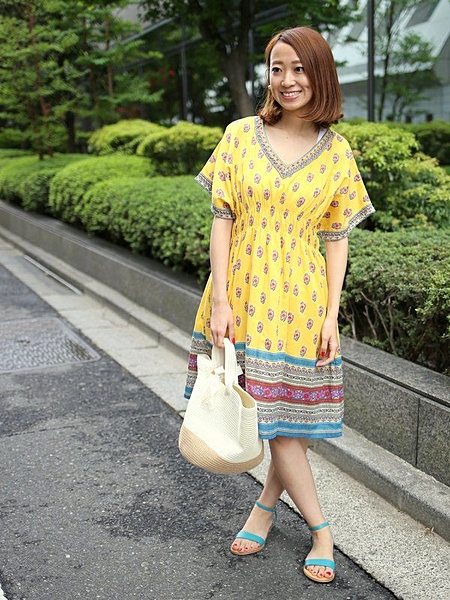 イエローとブルーの相性が抜群の花柄ワンピース。ハイウエストで脚長効果も。裾だけでなく、胸元にも花柄がいい感じに散りばめられています。