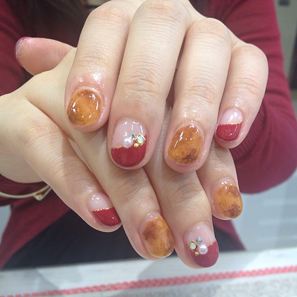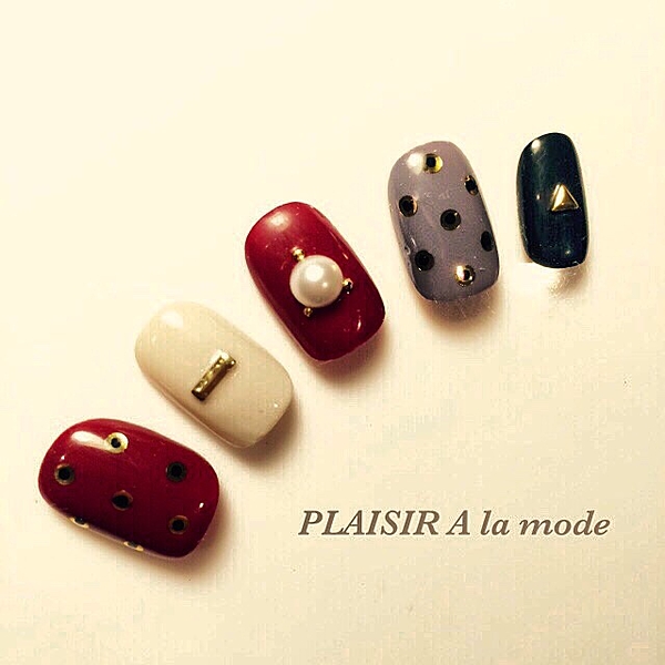 単色ボルドーに、ゴールドのスタッズ、ひび割れデザインをプラス。