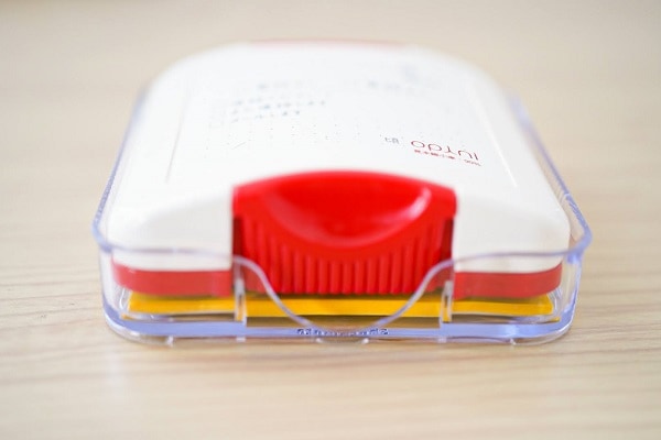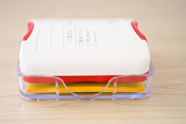 このケースには、ふせんを収納することができます。わざわざふせんを探す必要がないというわけですね。もちろん、収納時にはふせんにスタンプが押されないよう、ふせんとスタンプとの間には距離が設けてあります。