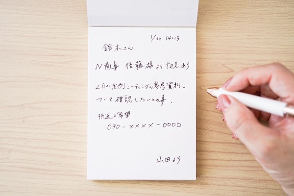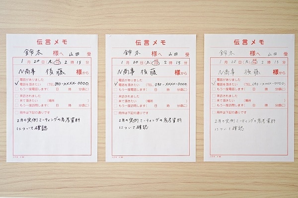 電話対応をスムーズにこなすコツは、抑えるべきポイントを事前に確認しておくことです。例えば、用件はもちろん、相手のフルネーム、折り返すための電話番号、電話があった日時などなど。そういうことを聞き忘れて怒られた経験がおありの方は多いでしょう。