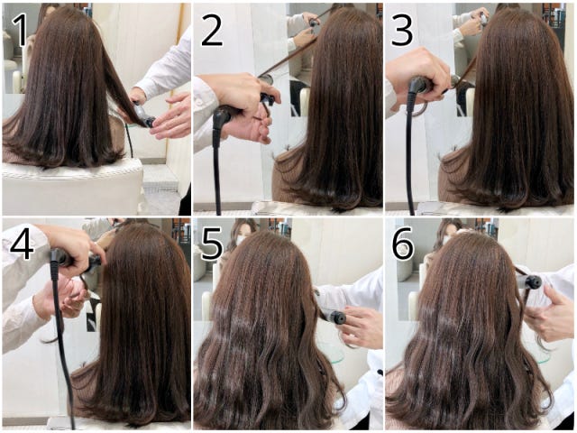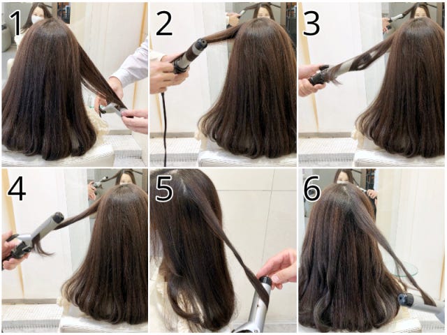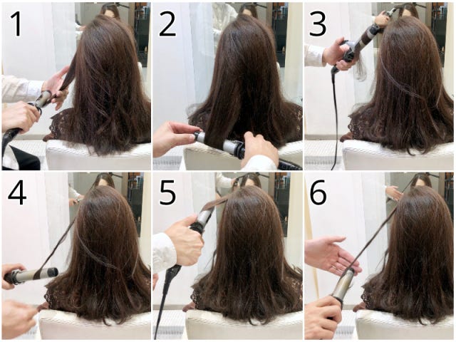 ⑤⑥ 顔周りトップの毛束をフォワードで巻きます。その時コテの先から毛束を逃しながら巻き進めます。(1つの毛束で逃し巻きを数回繰り返します)。顔周りから後ろに向かって計4毛束をリバース→フォワード→リバース→フォワードの順に巻きます。