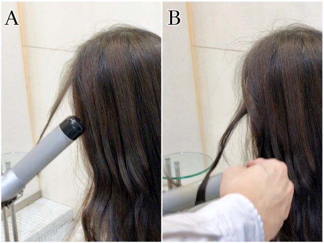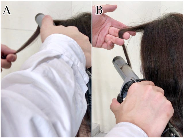 A:前髪はコテで挟んだ毛束を滑らすようにし巻きます。