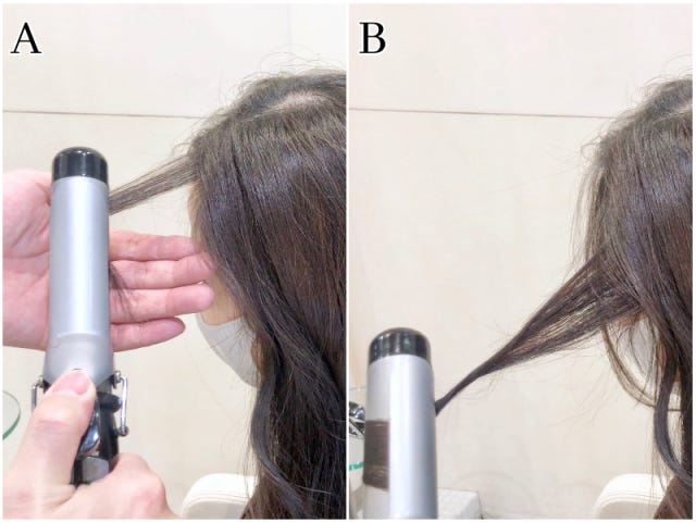 B:モミアゲ部分は巻いた毛束をコテの先から外しながら巻きます。