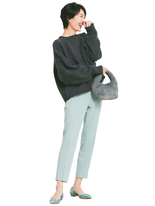 センタープレスパンツ¥8,990(プラステ)ニットプルオーバー¥7,150(スタイルミキサー/バロックジャパンリミテッド)ファーハンドミニバッグ¥8,250(ル タロン/ル タロン プリュ 有楽町マルイ店)ビジューパンプス¥28,600(ツル バイ マリコ オイカワ)