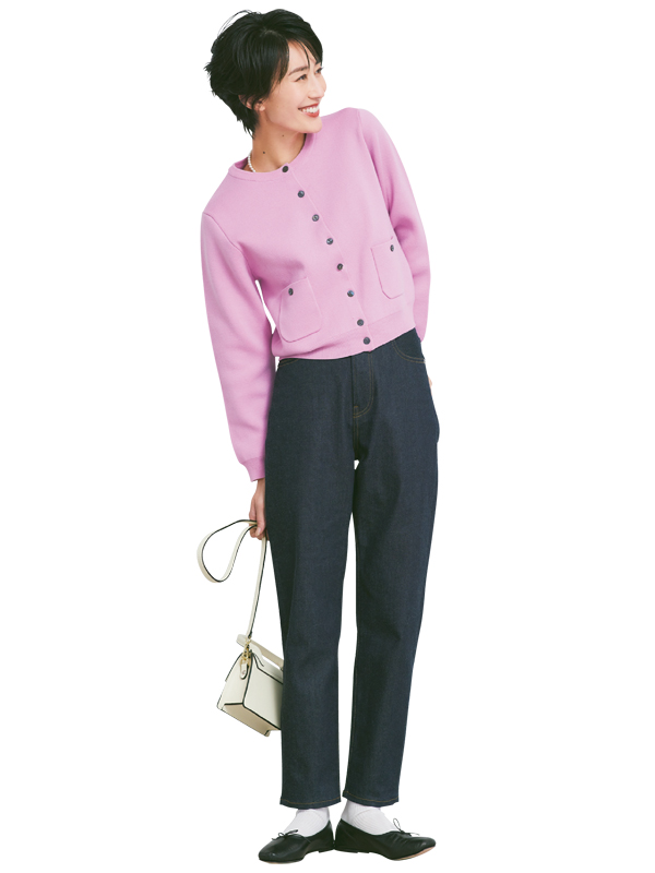 カラーカーディガン¥8,690(オメカシ/オメカシ 新宿ルミネエスト店)デニムパンツ¥18,000(ノーク バイ ザ ライン/ノーク)ショルダーバッグ¥15,400〈メゾン ヴァンサン〉バレエシューズ¥28,600〈スペルタ〉(ともにフラッパーズ)靴下/スタイリスト私物