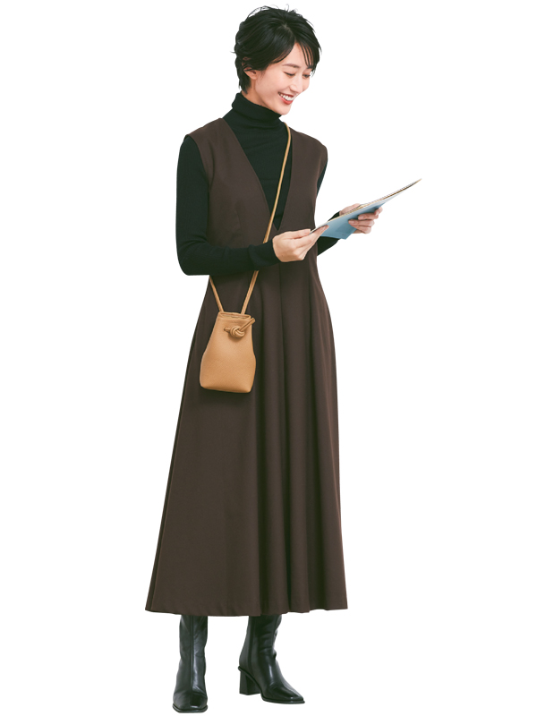 ワンピース¥6,050(ベースメント)タートルニット¥2,990(ユニクロ)巾着バッグ¥29,700(ヴァジック/ヴァジックジャパン)ミドルブーツ¥13,200(ル タロン/ル タロン プリュ 有楽町マルイ店)