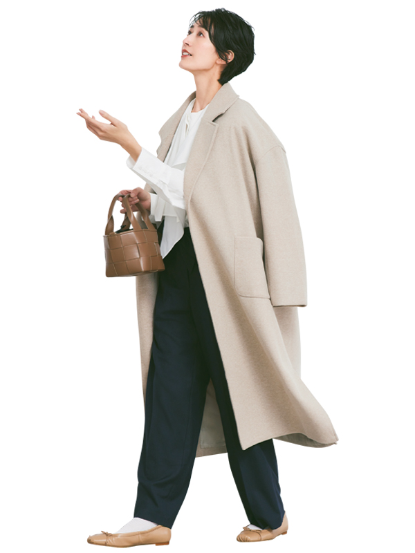 コート¥5,290(神戸レタス)ボリュームカラーブラウス¥18,700(MACHATT)センタープレスパンツ¥9,980(プラステ)ハンドバッグ¥16,500(ミロス/ル タロン プリュ 有楽町マルイ店)バレエシューズ¥38,500(ヒューン/アダム エ ロペ)靴下/スタイリスト私物