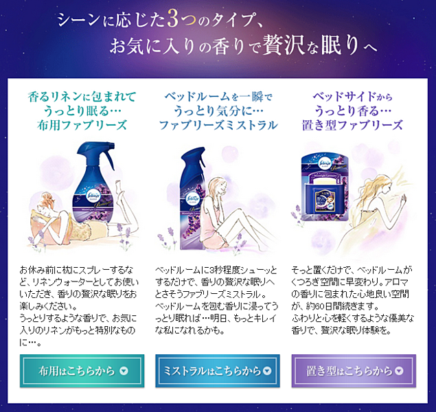 女の子は毎日大変。寝付きが悪い夜があったり、疲れてる時って逆に眠れなかったり。そんなときに、おすすめしたいのが、ファブリーズからでている「sleep」シリーズ。ジャスミンやラベンダーなど、落ち着く香りのラインナップで布団や枕に一吹きするだけで心地よい睡眠に導いてくれます♡本当は誰にも教えたくないけど、特別に。