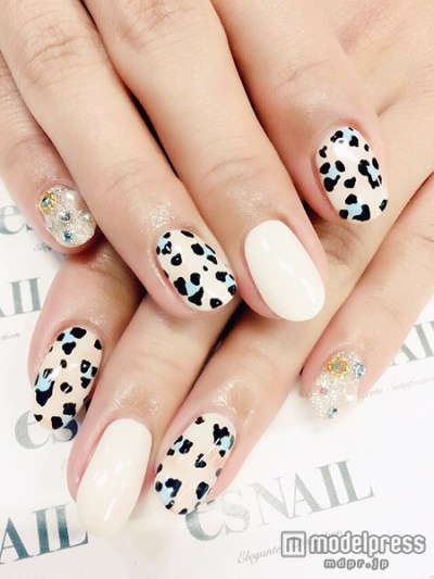 アイボリーベースにアイスブルーのレオパード柄と、1本ずつラメベースにストーンをオン。少しポップなレオパードが、流行のスポーツスタイルと相性が良さそうです。