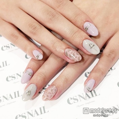 スモーキーなパープル・ピンク・グレーカラーにシルバースタッズでアート。そこにレオパード柄をプラスして秋らしさが増しつつも、スタッズが程よいスパイスとなっています。