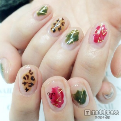 クリアベースにボルドーとカーキのニュアンスネイル。さり気なくレオパード柄が施されているだけで、一気に秋らしくなります。