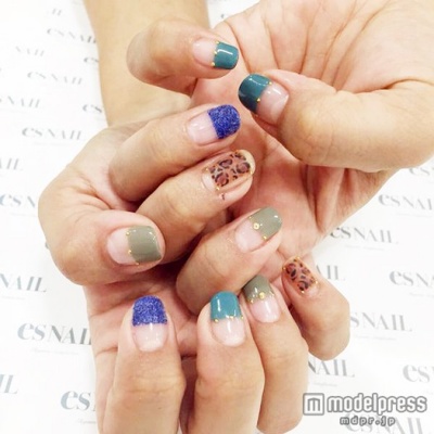 ◆マットとブロッキングブルーグリーンとカーキのセパレートフレンチに、マットなレオパード柄をブロッキング。さり気なく今年人気のベルベットも合わせた秋の異素材ミックスネイルです。